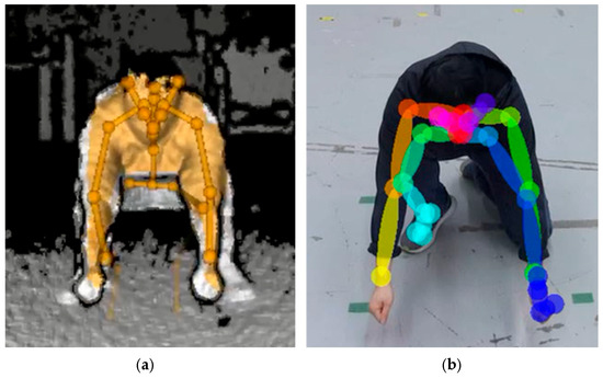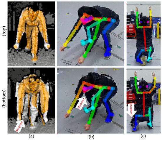 Occlusions remain a major contributor to human pose estimation errors [49]. In this study, occlusions were caused primarily by the task poses and the viewpoints. Table 8 shows how the occlusions by the pose affected the body estimation performance. When the arms are outstretched, towards the ground, the arm or leg can become indiscernible or invisible to the sensor. Poses 7, 8, and 11 showed the lowest number of acceptable pose estimations compared to the other poses, because the arms were placed in a downward position, occluding the lower-body joints. When the joints of interest were in closer proximity, some joints would cover the other parts of the body. Pose 5 puts the wrists near the hips, where the wrists can be seen only by the front or side-front viewpoints. Crouching poses align the ankle and the hip together, and the ankle was rarely estimated correctly. Pose 14 scored the worst due to occlusions from the arm during the crouch position. Figure 11 demonstrates the joint estimation errors caused by the task pose occlusions.