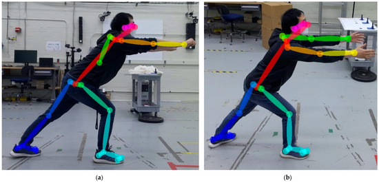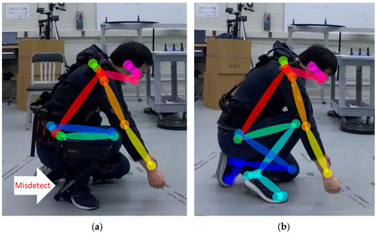 The purpose of the evaluation is to determine whether the skeletal joint estimation in the sets of images from each trial includes misdetections or misalignments and to decide whether the image set from each trial can be accepted for further data analysis. Since no software tools to determine misdetection and misalignment of pose estimations are known, the result was evaluated visually by the researcher. As described in Section 2.3, only 100 images were used for a single iteration. The evaluation results can differ over 100 images. Table 3 shows the evaluation examples of three different conditions, and Figure 8 shows how different results can occur for the same condition.