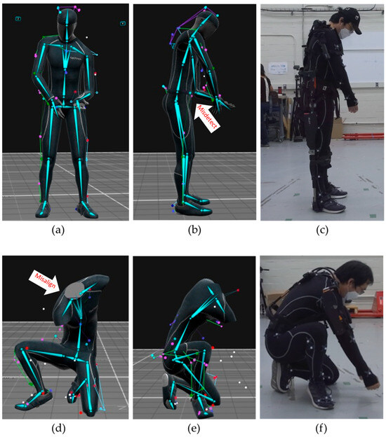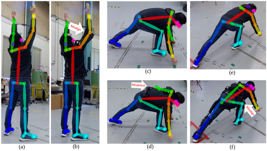 Several studies evaluated the joint poses indirectly—for instance, comparing a joint angle or a step distance to a reference motion capture system to determine the relative difference in joint detection and joint angles. Prior to evaluating markerless pose estimation methods, a methodology to curate the images with missed joint detection is proposed for evaluating both joint position and relative angle changes. Joint detection and position errors can be categorized into misdetections (Figure 3a) and misalignment (Figure 3b). Misdetection refers to when the estimated joint pose is out of the subject’s body, or the nearest joint from the estimated joint pose is not the target joint. Misalignment refers to when the detected joint is on the subject’s body but the detected joint deviates from the actual joint. A correct detection refers to a case where the skeletal joints appear to coincide with the subject’s joints (Figure 3c). By excluding results with misdetections or misalignments, both of which can be determined by visual inspection or with automation using a computational algorithm, joint position errors can be statistically measured via comparison with a reference system.