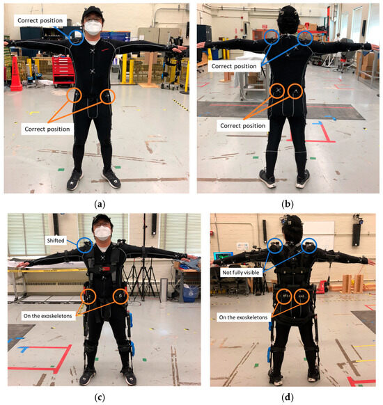 Example of the correct marker placements for the front (a) and back (b) of the control test and estimated marker placements for the front (c) and back (d) of the Type 1 exoskeleton test.
