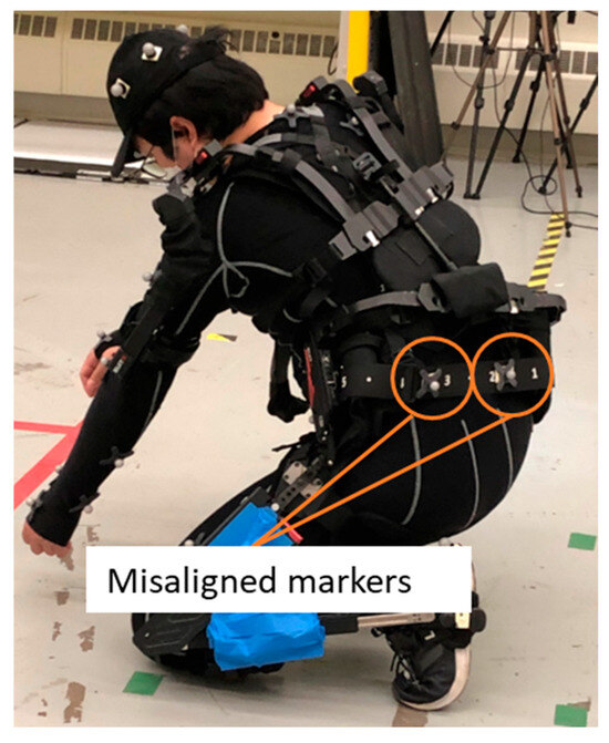 An OTS can also be susceptible to occlusions from exoskeletons and industrial poses. Ideally, the optical markers are placed accurately and consistently at each anatomical landmark to build a subject’s skeletal tracking model and to initiate a pose estimation. Each exoskeleton type in this study had overlapping positions with the anatomical landmarks. To address the issue, the optical markers were placed on the exoskeleton, or the optical marker placement on the subject was shifted from the anatomical landmark. When the positions of the anatomical landmarks are translated from the ideal position, the OTS software either builds a model with inherent joint position and rotation errors or it fails to build the body model. When the marker is placed underneath the exoskeleton, the OTS fails to find the marker. In contrast, when the markers are placed on the exoskeleton, additional errors occur in tracking the human movement. Figure 17 shows the shifted marker placements to take into consideration the relationship of the exoskeleton to the body. Marker placement errors can occur from differences in body shapes and or misalignments between the human and the exoskeleton, as shown in Figure 18.