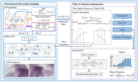 The mode decision algorithm aims to determine the appropriate mode for a vehicle, based on the elevation changes in a 2.5D path and the performance thresholds of wheel–leg vehicles. Given the future path of the vehicle, elevation map data, and basic performance parameters, it is required to ascertain the mode to be used by the vehicle as it passes through each path point. Figure 2 presents the architecture of the mode decision-making algorithm, which consists of an environmental interaction sampling module and a policy evaluation optimization module.