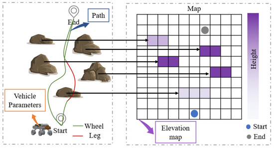 However, current path planning algorithms are primarily designed for single-mode terrestrial vehicles, lacking mode decision-making in the path, and are not suitable for multi-mode wheel–leg vehicles. If the 2.5D navigation algorithm designed for legged robots is employed, the wheel–legged vehicle must operate exclusively in legged mode throughout its trajectory. While this configuration enhances obstacle-crossing capability compared to conventional wheeled vehicles, it significantly compromises locomotion efficiency on flat terrains. Conversely, adopting navigation algorithms developed for traditional wheeled vehicles fails to utilize the obstacle negotiation advantages offered by the legged modality of hybrid wheel–leg systems. Therefore, to maximize the efficiency and obstacle avoidance capability of wheel–leg vehicles, it is necessary to integrate a mode decision module into traditional 2.5D path planning algorithms to dynamically determine the most appropriate driving mode. Currently, there are no directly applicable modal decision-making frameworks available; however, decision models from other domains may serve as potential references [36,37].