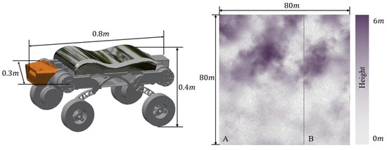 The hardware configuration used in the experiments consisted of an Intel i7-13700KF processor with 16 GB of RAM and an NVIDIA GeForce RTX 4060 GPU. The software environment was based on the Ubuntu 20.04 operating system, with inter-module communication facilitated by the ROS (Robot Operating System) framework. The deep reinforcement learning model was implemented using the PyTorch 1.13.0+cu116 framework. The policy neural network integrated map information, path data, and the performance characteristics of the wheel–legged vehicle to determine the locomotion mode selection at each path point. Figure 5 displays the vehicle configuration and elevation map. The training map used in the experiments includes both depressions and hilly terrains. The entire map measures 80 m in both length and width, with a resolution of 0.156 m, with depressions and hilly terrains each occupying half of the map. The IPP-MD method first trains the agent on the map, where the agent collects trajectory data through interaction with the environment and updates the policy using this trajectory data. This process is repeated until the agent achieves the desired performance. To evaluate the performance of the proposed IPP-MD method, two sets of experiments were conducted. The first experiment provides a detailed analysis of the training process of the IPP-MD method, while the second experiment deploys the trained model and tests it across various field terrains, comparing its computational time and mode-switching frequency performance with a rule-based mode decision method. Utilizing regions different from the training set allows for the validation of the algorithm’s generalization capability. The IPP-MD algorithm employs a multilayer perceptron with four hidden layers, each containing 1024 units, to approximate the policy and value functions. The learning rate decreases linearly from to 0, and the standard deviation decays exponentially from 1 to 0.