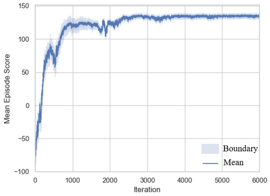 The training consists of 6000 iterations, with each iteration comprising 2000 time steps. The Adam optimizer is used for policy updates, and the score changes during training are shown in Figure 6. The figure represents the average value across five training runs for each iteration, illustrating the trend in reward changes during the training process. The shaded area indicates the value boundaries from the five training runs, reflecting the fluctuation of reward values during training.