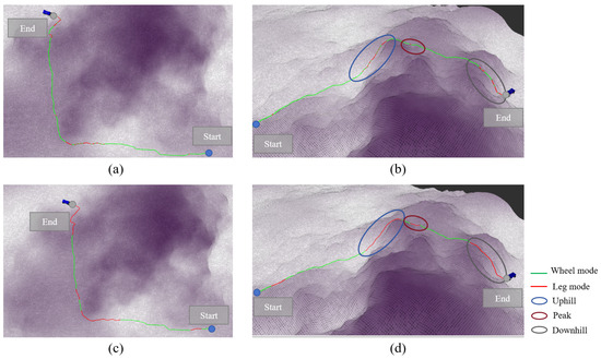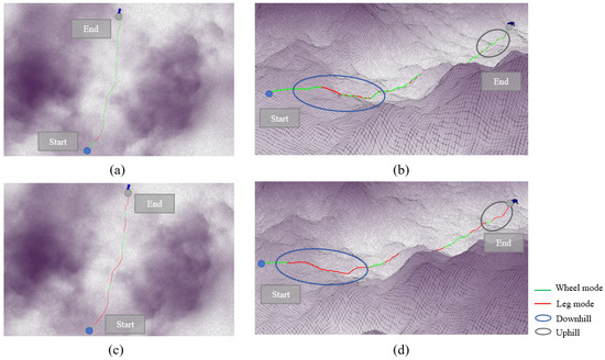 The algorithm was validated on hill terrain, and the mode decision results are shown in Figure 7. Figure 7a,b display the IPP-MDalgorithm, while Figure 7c,d present the rule-based mode decision algorithm. Figure 7a,c show the overhead views of both algorithms, and Figure 7b,d offer a clearer perspective to illustrate the variation in terrain height. The colors along the path represent the mode used at each point: green indicates the wheeled mode, and red indicates the legged mode.