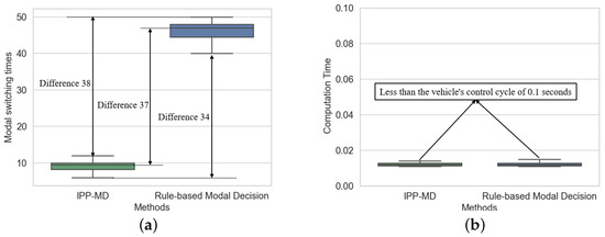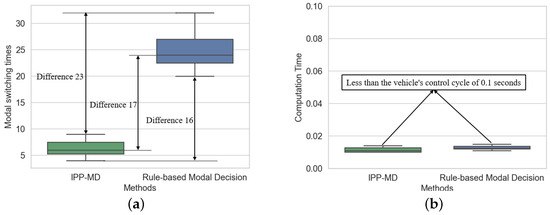 Comparison of mode switching frequency and computation time of two methods in hilly terrain. (a) represents the comparison of modal switching times, and (b) represents the comparison of calculation time.