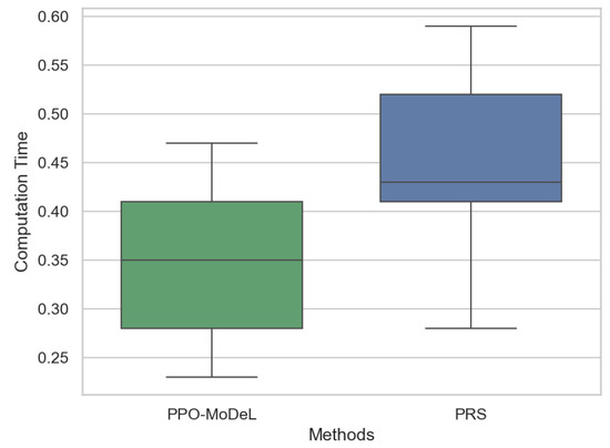 To validate the computational efficiency of the proposed algorithm, a comparative analysis was conducted between the PPO-MoDeL method and the advanced pseudo-random sampling (PRS) method [38] in terms of computation time. Multiple routes were selected for testing both methods, and the experimental results are presented in Figure 11. As illustrated in the figure, the PPO-MoDeL method exhibits significantly shorter computation time, thereby demonstrating its superiority in computational efficiency. Both methods show similar fluctuations in computation time, indicating that their performance varies with route length. Nevertheless, the computational time of both methods remains within acceptable limits, ensuring real-time applicability for path planning algorithms.