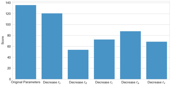 To validate the effectiveness and rationality of the reward mechanism, relevant ablation experiments were conducted, with the experimental results illustrated in Figure 12. The experiments systematically eliminated each reward component individually to investigate the role of each reward term in the algorithm’s training process. As shown in the figure, the original parameter configuration achieved the highest reward score, demonstrating that the combination of the original reward function yields the best algorithmic performance. Among these components, the event completion reward had the least impact on algorithmic performance, as this term primarily accelerates training convergence rather than influencing the final performance. In contrast, the accident occurrence reward exerted the most significant influence, as this term ensures the safety of the wheel–legged vehicle, which serves as the fundamental prerequisite for successful route completion. The remaining three reward terms guided the algorithm in making appropriate modal decisions, thus exerting a moderate influence on the final performance.