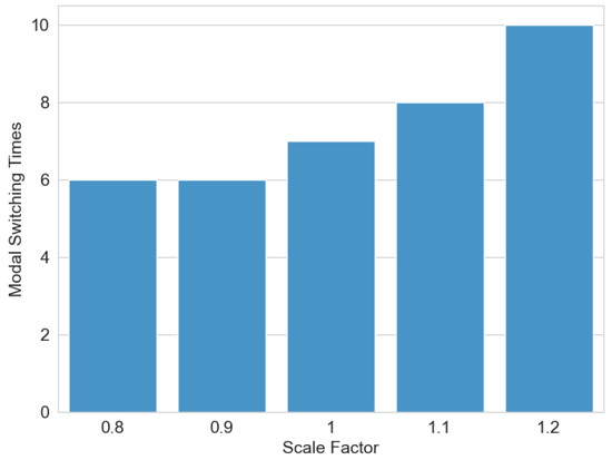 To investigate the influence of environmental parameters on algorithm performance, a sensitivity analysis was conducted. A height scaling factor was introduced to proportionally adjust the terrain elevation in the digital elevation map. As illustrated in Figure 13, a scaling factor of one maintains the original terrain elevation, values below one reduce the terrain height proportionally, and values above one amplify it. The experimental results demonstrate a positive correlation between terrain height amplification and the frequency of modality transitions. Specifically, as terrain elevation increases, the system exhibits a higher number of wheel-to-leg modality switches. This phenomenon occurs because heightened terrain variations elevate locomotion risks for the wheel–leg vehicle, triggering more frequent transitions from the wheeled to legged modality to ensure safe navigation, thereby increasing the overall modality switching count.