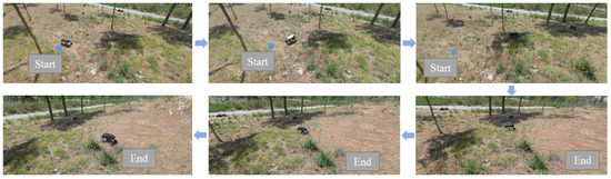 To validate the robustness of the algorithm in real-world environments, we conducted field tests using a self-developed wheel–leg vehicle as the experimental platform. The vehicle is equipped with a distributed sensor network comprising inertial measurement units and LiDAR, with localization achieved through LiDAR odometry. The experiments were performed in unstructured off-road terrain, including uphill slopes and sandy surfaces. As shown in Figure 14, the starting point was selected in a lower-altitude area, while the destination was set in a higher-altitude region. Figure 14 illustrates the actual motion trajectory of the wheel–legged vehicle: it first traversed a relatively flat terrain, then ascended an inclined slope, and finally crossed another flat section to reach the target location.