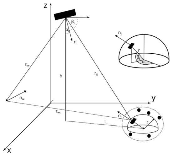 where r is the radius of the sphere around the receiver that parameterizes the position of the receiver, L is the distance from the transmitter to the receiver in the X–Y plane, and h is the height difference between the transmitter and the receiver.