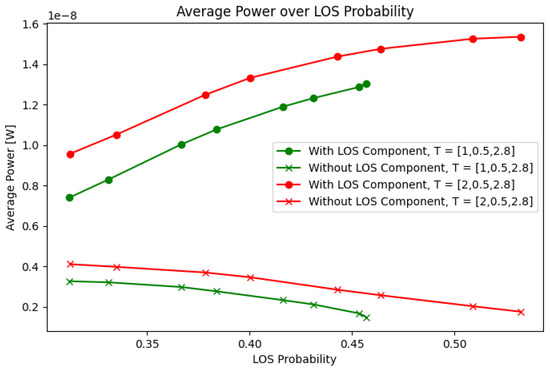An important metric for assessing the effect of the receiving angle is the power outage probability. However, as will be shown in the following sections, the power outage probability cannot be obtained analytically, given the interdependence of the receiving angle with the mobility of the user and the orientation of the receiver. However, it is possible to obtain the LOS probability, which correlates strongly with the system’s average power. Given a variable angle of inclination for the receiver from to , Figure 2 shows the average power compared to the LoS probability.