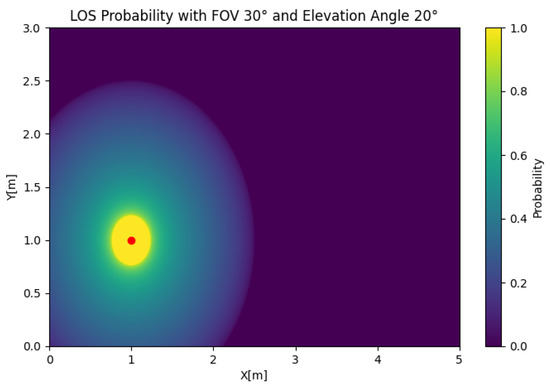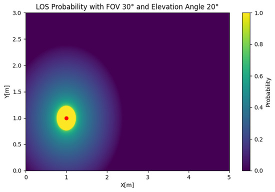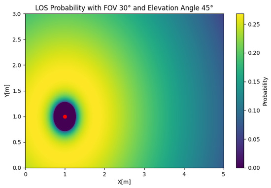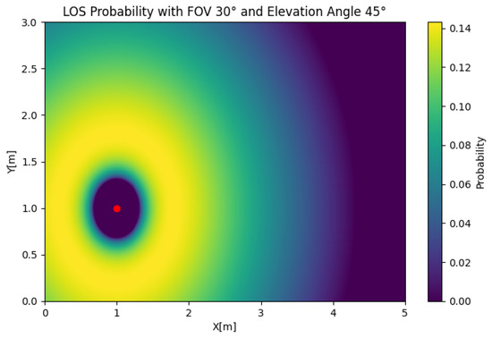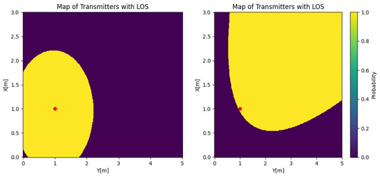 As using the probability density function has an important difference to the orthogonal case, the analysis of the system changes. Since L is not deterministic, the value of the function changes with respect to the probability given by the mobility of the user, and the power will depend on both and L. To illustrate the difference between both systems, Figure 3 shows the set of transmitters with their LoS probability for the orthogonal case () and the non-orthogonal case (, ). The receiver is positioned at , which is represented by the red dot in both figures. The geometry of both cases shows the reason behind the complexity of obtaining the LoS probability. In the orthogonal case, the probability can be calculated by taking the indicator function over the area of potential transmitters. However, in the studied case, each coordinate will have an LoS probability that can be understood as the integration over the realization of rotating the receiver around itself. In that case, points closer to the origin will still have a probability of one, as they will always have the link in each rotation, but points far from the receiver will be visited with less frequency.