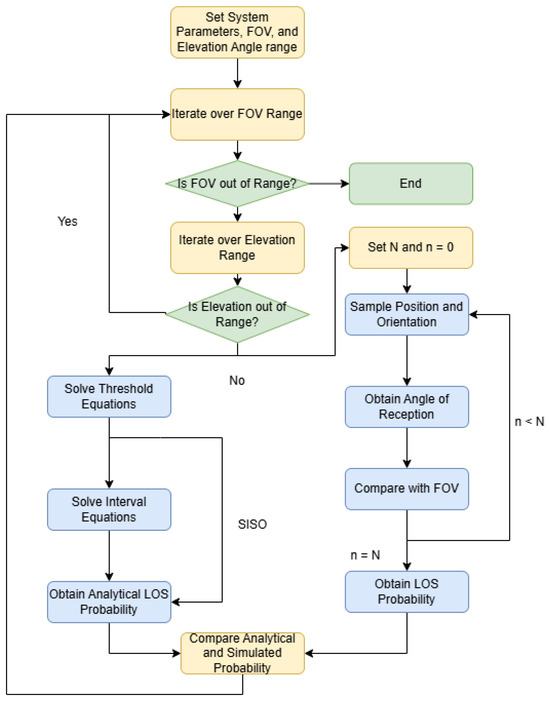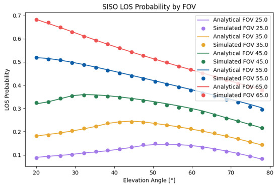 In Figure 7, the analytical SISO case is compared with the simulated case. As can be seen, the analytical case matched perfectly with the simulated data, with an error of . Evidently, the LoS probability increased monotonously with respect to the FOV. However, each FOV had an optimal elevation angle, which decreased with the FOV. The optimal value was not only a product of but also a product of h and r. A higher h increased the probability, with the cost of a higher path loss. For example, in the case of an FOV of , increasing the height difference from to increased the LoS probability by , or .