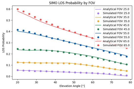 Figure 10 compares the analytical results with the simulated results for the SIMO case. As can be seen, the analytical results matched well with the simulated results. The small error with a higher FOV was a product of the effect of the approximations of the inverse cosine function. The total error was . Unlike in the SISO case, the LOS probability was rather constant with low elevation angles until it started falling off from the same peak as in the SISO case. This effect can be attributed to the faster fall in the LoS probability with respect to the radius. As the effect was a product of the decay near the borders, placing the transmitter closer to the center would heavily improve the LOS probability inside the cell for higher elevation angles while not impacting the lower elevation angles. In the calculated scenario, moving the transmitter from to improved the LoS probability from to in cases with a high elevation angle, corresponding to an increase of . Similarly to in the SISO case, the optimal elevation was a factor of both the elevation and height. Increasing the height difference from to increased the probability by , or .