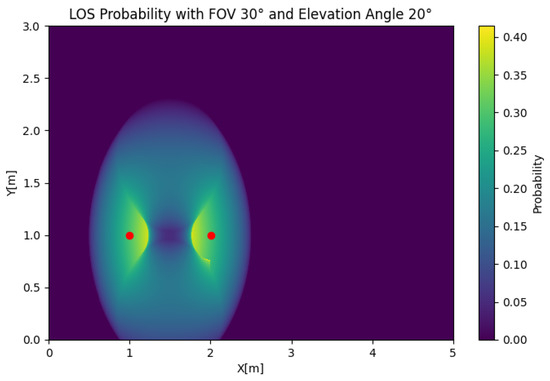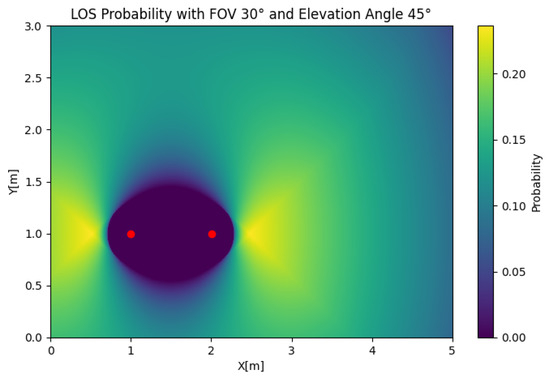 In Figure 11, the MISO LoS probability is depicted for any position of the user. To reduce the complexity of the problem, we obtained the results using two transmitters. In this case, we took an FOV of and an elevation of and used two transmitters that were from each other. The figure shows that the LOS probability was 0 around both LEDs, which was the product of combining the effect of the value of orienting both receivers away from one of the sources and the orientation being exclusively towards one of the transmitters. We could also observe that the LOS probability had a maximum at the sides of the transmitter, creating two lobes that decreased with respect to the radius, which was an important difference compared to the circular contours obtained in the SIMO and SISO cases. If we set , as shown in Figure 12, the LOS probability had the same symmetric shape, but the maximum probability was obtained between the LEDs. In the MISO case, the change in the LOS probability due to the elevation was significant. However, a reduced simultaneous LOS probability can be advantageous, depending on the desired properties of the system.