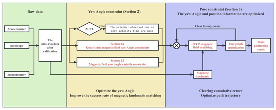 This section proposes a method for constraining the pedestrian yaw angle using magnetic field yaw angle information. First, the SINS algorithm based on a single inertial sensor is introduced, and its results are compared with the method proposed in this section. Section 2.2 and Section 2.3 introduce the first two contributions of this paper.