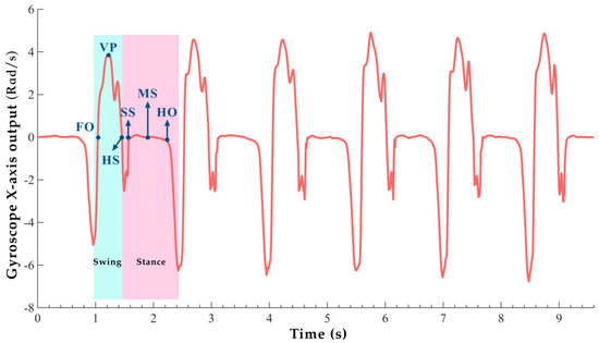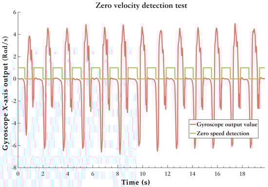 Figure 5 shows the zero-velocity detection results. The zero-velocity interval corresponds to the flat-foot phase described in Section 2.2. The red curve represents the gyroscope X-axis output, as it best reflects the gait information of human movement. The green curve, where the value is 1, indicates the flat-foot phase detected by the algorithm. It accurately reflects the regularity of human movement, corresponding to the SS to HO part in the gait cycle curve.