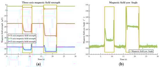 The change in magnetic field information after being disturbed. The data inside the orange box represent the output under interference. (a) The change in the output information of the three−axis magnetometer after being disturbed; (b) Variation in the magnetic field yaw angle before and after disturbance.