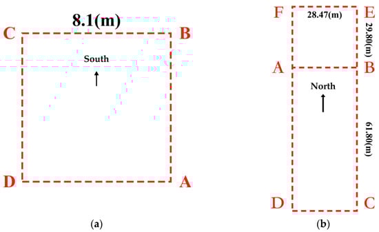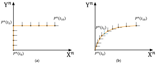 Figure 7 shows a diagram of pedestrian turning behavior, with the orange curve representing the pedestrian’s walking trajectory. It is evident that in both Figure 7a,b, the pedestrian completes the turning behavior between time and . However, in Figure 7a, the turning behavior occurs only at time (to emphasize the difference, the turning behavior is extreme in this case). In contrast, in Figure 7b, the pedestrian’s turning behavior is smoothed over the entire time from to . Comparing the turning behavior between Figure 7a and the turning behavior in Figure 7b, both involve a 90 yaw angle change, but the displacement in Figure 7a is zero. On the other hand, the displacement in Figure 7b is the distance between points and . For any point in space , even if the current environmental magnetic field is interfered with, as long as the interference source is a long-term stable and unchanged source, when the sensor’s orientation changes, if no displacement occurs, the point can be considered as a quasi-static magnetic field point. In an environment where the magnetic field is disturbed, if the pedestrian walks according to the method in Figure 7a, the change in magnetic yaw angle can be used to constrain the change in gyroscope yaw angle, thus achieving higher accuracy and improving overall positioning accuracy.