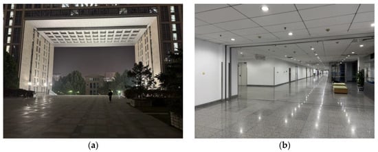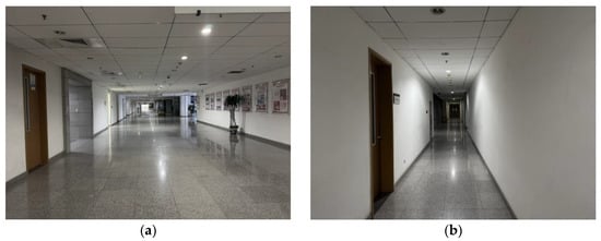 Figure 8 shows the environments of this test, and Figure 9 shows the results. Figure 9a shows the magnetic field features in the environment of Figure 8a, and Figure 9b shows the magnetic field features in the environment of Figure 8b. It can be seen that the magnetic field features in various typical scenarios remain stable and similar across different time periods. Moreover, in the typical experimental scenario of the open indoor space shown in Figure 8b, where pedestrian flow changes over different periods, the impact on the magnetic field features remains minimal. Therefore, it can be concluded that the environmental magnetic field feature distribution in this experiment’s indoor or quasi-indoor scenes exhibits spatiotemporal stability. It should be noted that there were no large-scale changes in the indoor environment in the test setting. Building materials such as steel reinforcement and cement are the primary causes of changes in indoor magnetic fields. If large-scale changes in the indoor environment occur, the indoor magnetic field will inevitably change, and the aforementioned spatiotemporal stability will no longer hold.