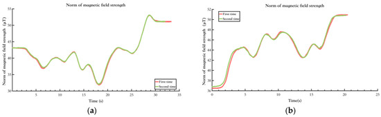 The spatiotemporal stability of the environmental magnetic field is the basis for magnetic landmark matching. The field must remain stable over a certain period to utilize magnetic landmarks in the magnetic field map for matching. Experiments were conducted in indoor open spaces and corridors. Test subjects held magnetic field sensors, walked along the same path, and were tested at different times. The two tests were separated by 24 h.