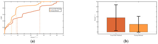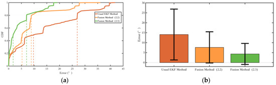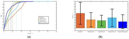 Comparison of yaw angle error in route 3. (a) Error probability distribution of each method; (b) Error bars of each method. The range indicated by the black line represents the RMS value of the corresponding error.