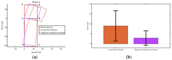 Section 2 proposed an improved EKF method, which corrects inertial sensor data using magnetic field information, further suppressing heading angle errors. The fusion method utilizes the intensity of magnetic field variations to assess the reliability of magnetic field data while also incorporating magnetic yaw angle variable constraints based on the characteristics of pedestrian turning states. The overall yaw angle error is suppressed by fully utilizing the environmental magnetic field information, thus enhancing accuracy. The relevant experimental results will be presented and analyzed collectively in Section 4.2.