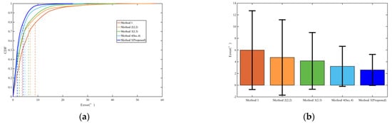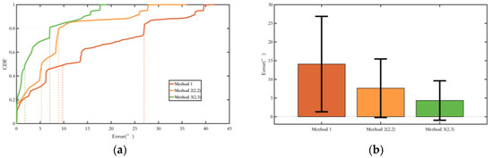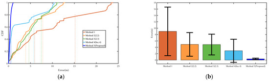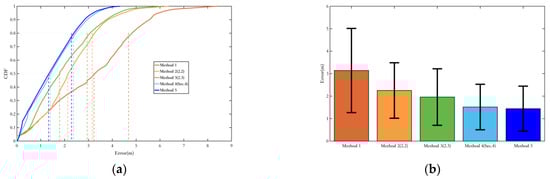 Comparison of positioning error in route 3. (a) Comparison of positioning error probability distribution of each method; (b) Comparison of positioning error bars of each method. The range indicated by the black line represents the RMS value of the corresponding error.