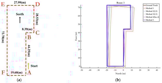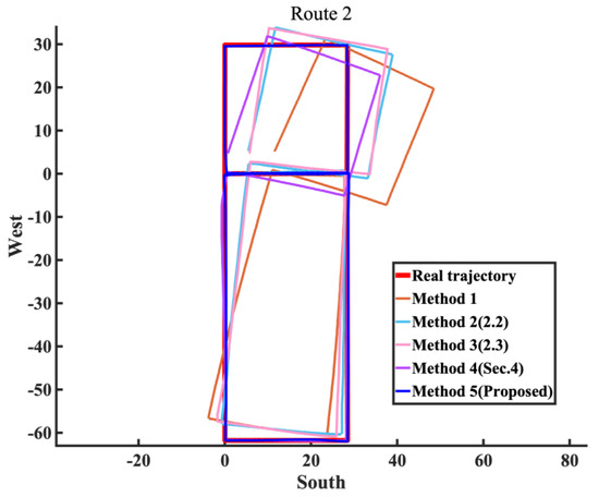 It is evident that the proposed Methods 2, 3, and 5 in this paper show progressively improved optimization results in terms of both the average error and the RMS error, which represents data fluctuations. Although the environment of route 3 has more magnetic interference, the incorporation of magnetic field observations in Methods 2 and 3 overall enhances the positioning performance. Moreover, Method 5, which fuses magnetic heading with magnetic field matching, makes more effective use of the magnetic field information, resulting in better yaw angle optimization. Compared with the EKF filtering method using only a single inertial sensor, the error is reduced by over 50%.
