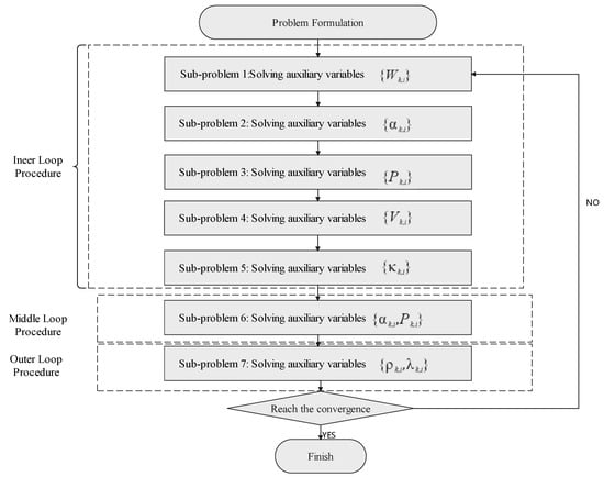 where is a constant between 0 and 1. It is easy to see that, when , the problem is solved to a Karush–Kuhn–Tucker (KKT) stationary solution. After n iterations of the algorithm, the violation indicator will approach some threshold, , and if (where is defined accuracy threshold), we obtain the approximate KKT solution of the problem. The flowchart and pseudocode of the proposed DB-IPDD algorithm are shown in Figure 2 and Algorithm 1, respectively.