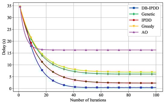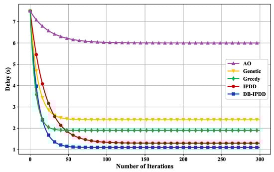 We assume that there are four SSs, each positioned at a distance of m from the MS. We alter the maximum transmit power of the MS by 500 W, 1000 W, 1500 W, 3000 W, 6000 W, 10,000 W] and the bandwidth by [200 MHz, 400 MHz, 600 MHz], observing their impact on the maximum time delay, as shown in Figure 5. The horizontal axis represents the number of iterations, and the vertical axis represents the delay in seconds.