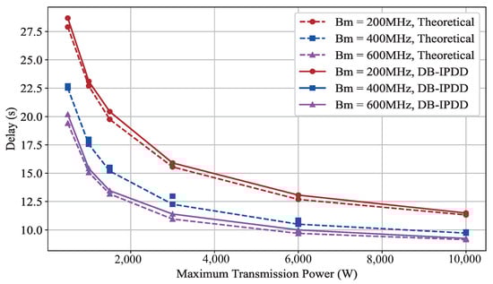 We choose different bandwidths from [200 MHz, 500 MHz, 800 MHz] and compute the delay under the condition of different main frequencies. The result is shown in Figure 9, which indicates that a 4 kW elevation in transmission power threshold achieves 24.89% total delay reduction, confirming the critical relationship between power configuration and latency performance.