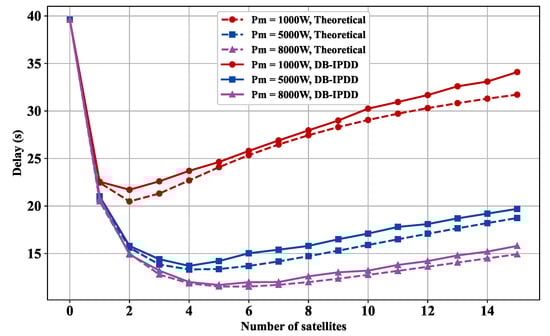 Delay versus satellite number: simulation and ideal delay curves under different transmission powers.