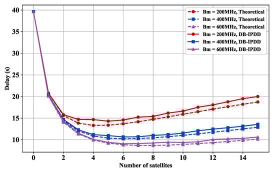 As shown in Figure 7, we choose different bandwidths from [200 MHz, 400 MHz, 600 MHz] and observe how the delay varies with the number of satellites in different bandwidths. Figure 7 shows that each 300 MHz bandwidth increase reduces data transmission delay by 22.5%.