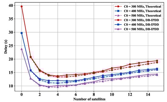 Delay versus satellite number: simulation and ideal delay curves under different main frequency.