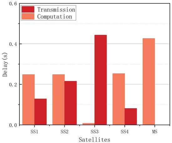Based on our analysis, the procedure can be divided into two parts, i.e., transmission and computation. The comparison in each satellite is shown in Figure 14. Generally speaking, as the distance increases, the computation delay tends to decrease while the transmission delay increases, and the reverse holds when the distance decreases.