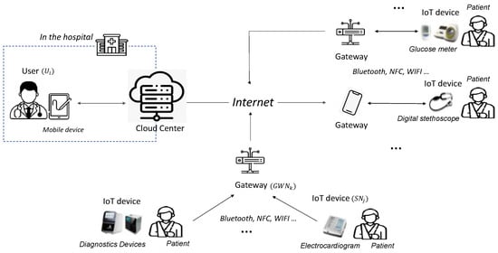 The proposed scheme targets a telemedicine system model, as shown in Figure 1, and consists of four entities: the user, cloud center, gateway, and IoT device. In this model, a doctor and their mobile device within a hospital are defined as the user, while a medical device that collects patient health information is classified as an IoT device. The gateway transmits data from the IoT device to the cloud center, which serves as a trusted hub for collecting, monitoring, managing, and processing patient information before transmitting it to the user. Each participant is described in detail below.