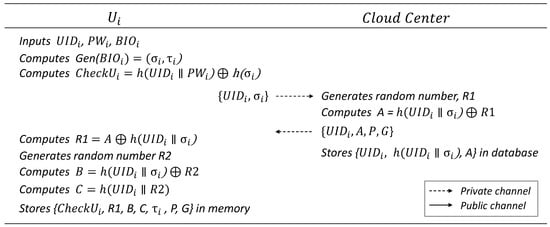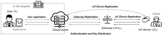 - Cloud Center (): The is a trusted entity responsible for processing, managing, storing, and distributing patient information collected from multiple gateways to users. It plays a critical role in telemedicine services, requiring substantial computing resources to handle vast amounts of data from remotely located IoT devices. In the proposed scheme, the cloud center facilitates authentication and key distribution by securely sharing secret parameters during the registration process of , , and . It is assumed that the is securely managed and protected from attackers. In the cloud-assisted IoT for telemedicine services proposed in this paper, the cloud center does not play the role of a simple gateway that supports mutual authentication between users and IoT devices but is proposed as a centralized scheme to perform monitoring and analysis of patient information collected from IoT devices using the computing resources of the cloud center. In particular, in telemedicine services, patients (IoT devices) are often assigned to a doctor in advance, and the doctor has to manage a large number of patients, so a centralized scheme is a more realistic service model than a decentralized or peer-to-peer scheme.