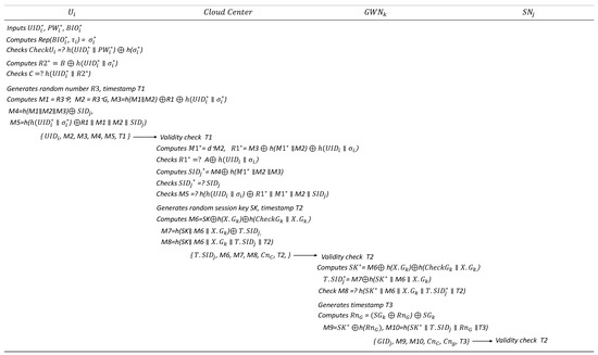 Wazid et al. [13] introduced an approach where the user carries out , which corresponds to 535.01 s. Their scheme does not involve a cloud center, so the gateway node handles , taking 2.03 s. On the sensor side, is performed, resulting in 1.3 s.