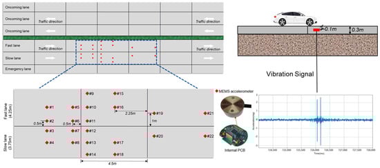 In the realm of pavement monitoring, a variety of methods have been implemented to analyze structural vibrations due to dynamic vehicle loading. Stocker et al. employed vibration sensors and machine learning for vehicle detection and classification, achieving detection accuracy of between 94% and 100%, and classification accuracy ranging from 43% to 86% [22]. Bajwa et al. designed a wireless sensor network (WSN) with acceleration sensors for reporting pavement vibrations and vehicle-detection sensors for logging vehicle arrival and departure times, alongside an access point for data synchronization and recording [23]. Addressing energy self-sustainability and data transmission cost issues in WSN-based pavement vibration monitoring, Klis et al. proposed integrating existing spectral–temporal information with novel compressive sensing techniques, fostering robust signal reconstruction and reducing transmission expenses [24]. Zhao et al. used distributed optical vibration sensors to record pavement vibrations from dynamic loads, applying empirical mode decomposition for signal reconstruction and feature extraction, aiming to discern axle configurations and vehicle speeds [25]. Ye et al. developed a printed circuit board with three MEMS accelerometer chips (VS1002, MS9001, and ADXL355). By testing the sensing performance of the three MEMS accelerometer chips, in terms of sensitivity, linearity, noise, resolution, frequency response, and temperature drift, it was found that the VS1002 had the highest sensitivity and resolution [26]. To effectively use data on temporal, spatial, and spectral vibration distributions of PCC pavement, Zeng et al. introduced a method for reconstructing and analyzing vibration fields from one-dimensional measured data, effectively reflecting traffic behaviors like braking and lane-changing [27].