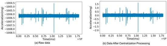 A feature of this preprocessing was the centralization of signal magnitudes. This involved adjusting each point in a data set by subtracting the average value of all points in that set, as described in Equation (1). Post-centralization, the mean of the acceleration signals was adjusted to 0. This process is visualized in Figure 3, where part (a) displays the original, raw signal data, and part (b) shows the data post-centralization.