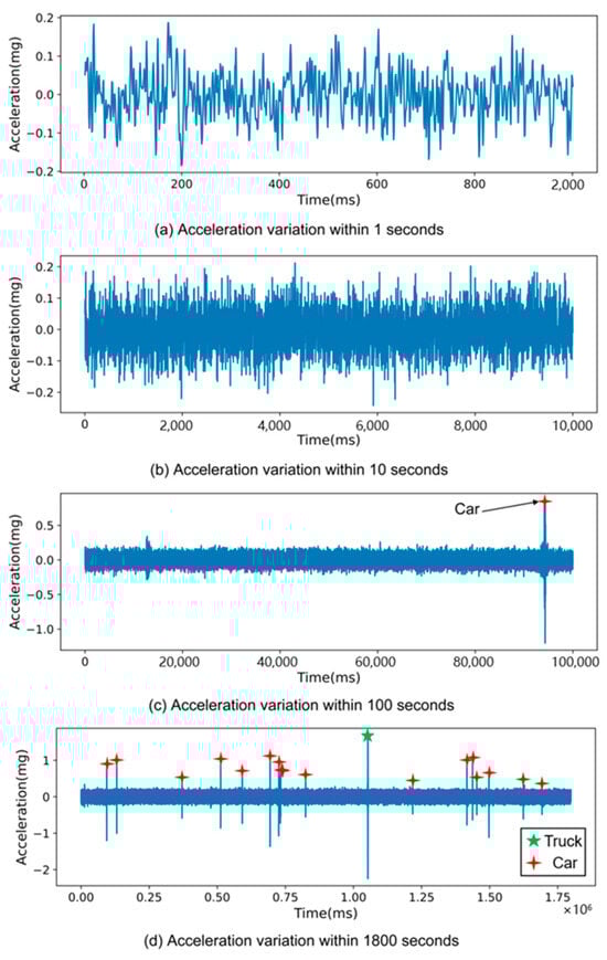 In Figure 4a, the scenario without vehicle traffic is depicted. Here, the sensor’s acceleration response mainly exhibits irregular noise with a minimal amplitude. Moving to Figure 4b, the pattern remains largely consistent—predominantly small-amplitude, irregular noise dominates the signal.
