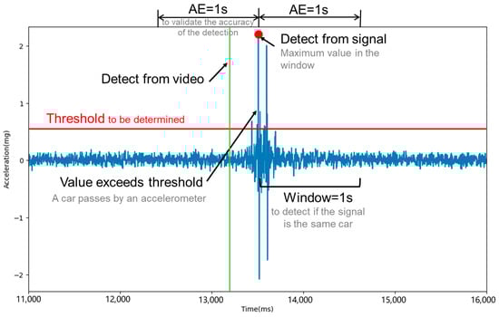 For this study, the label-recording interval was 1 s, the sensor-recording interval was 1 ms, and the window interval was 1 s, necessitating an AE exceeding 1 s. Setting the AE to 1 s, as noise levels were substantially lower than the magnitudes of vehicle-induced signals, meant that detection outcomes were not affected. Furthermore, the proposed thresholding method, in conjunction with the window setting, effectively distinguished between single and multiple vehicle passages. Validation with video data confirmed that multi-axle vehicles (e.g., trucks) were consistently detected as single events, while consecutive vehicles were correctly separated.