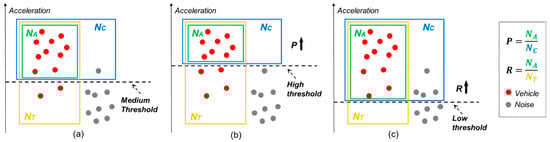 Figure 6 demonstrates how the chosen threshold level impacts these metrics. A higher threshold generally reduces the sensor’s tendency to mistake noise for true signals, thereby improving detection precision. However, this also means that some genuine signals may be missed, lowering the detection recall. In contrast, a lower threshold increases the likelihood of noise influencing the results, decreasing precision. This approach captures a higher proportion of true vehicle signals, enhancing recall.