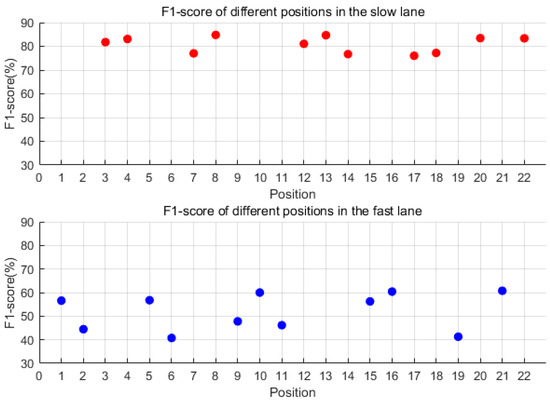 For each of the 22 sensors, individualized optimal thresholds (as listed in Table 2) were determined through exhaustive evaluation across eight candidate threshold values (0.3–1.0 mg). Each sensor’s F1 score was calculated based on its own optimal threshold, ensuring that performance metrics reflected the tailored adaptation to localized signal characteristics and noise conditions. Figure 8 visualizes these sensor-specific F1 scores, with red and blue markers distinguishing slow-lane (n = 11) and fast-lane (n = 11) sensors, respectively. Analysis revealed significantly superior detection performance in the slow lane, where F1 scores ranged from 75% to 85% compared with 40–60% in the fast lane. Among slow-lane sensors, #8 achieved peak performance with an F1 score of 84.79% (precision = 83.9%, recall = 85.7%) at a 0.4 mg threshold. Three additional sensors (#20, #22, and #13) exceeded 83% F1 score, suggesting these four positions as optimal deployment locations. The performance gap between lanes demonstrates a 35–45% relative improvement in slow-lane detection capability, highlighting the critical influence of traffic flow characteristics on sensor effectiveness.