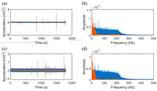 Acceleration signal before and after denoising. The blue curve is the original signal, and the red curve is the signal after denoising. (a,c) The time-domain vibration signal and (b,d) the frequency-domain vibration signal, respectively.