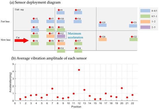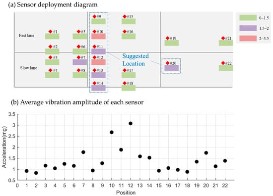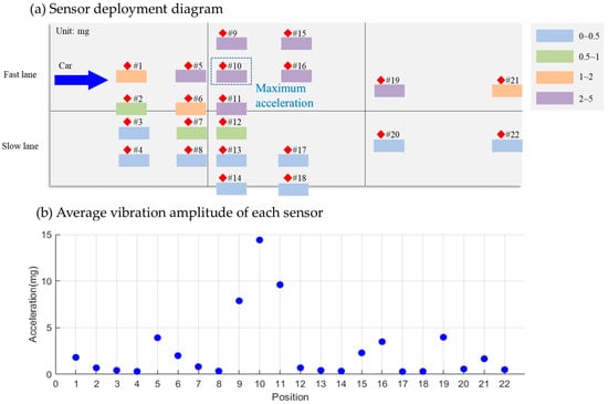 As seen in Figure 11, in the fast lane, Sensor #10 registered the highest average acceleration signal at 2.67 mg. In the slow lane, Sensor #12 recorded the highest average acceleration signal, measuring 3.07 mg. A comparison of signal responses across different sensor positions reveals that sensors at the front of the slab exhibited the strongest response, followed by those at the rear, while mid-slab sensors showed the weakest response. Consequently, it is advisable to place sensors at the slab’s front, as marked by the blue frame in Figure 11.