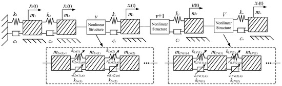 where and represent the nonlinear elastic restoring force and the nonlinear damping force produced by the nonlinear element, respectively. and represent the nonlinear stiffness and nonlinear damping of the ith nonlinear element in the vth part of the nonlinear structure, respectively. The vector of the nonlinear forces produced is